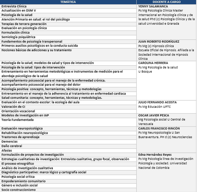 A continuación encontraran un listado de temáticas y el profesional a cargo, los cuales serán ofertados de acuerdo a la institución o grupo solicitante, pueden ser impartidos en las instalaciones de la fundación o fuera de ella.